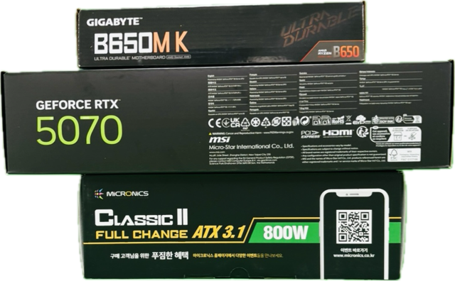 RYZEN7 9800X3D RTX 5070 D7 12GB 게이밍 트리오 B650M (PCIe 5.0 지원) DDR5-6000 32GB(16GB*2) SSD 1TB 800W BRONZE RTM(black) / AK620 |