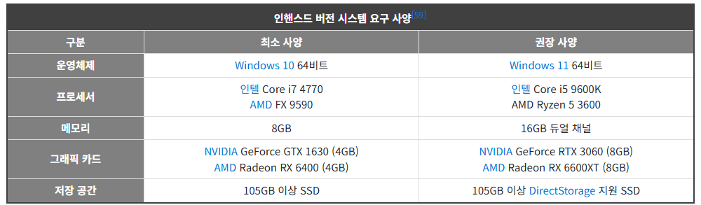 현재 나무위키에서 제공하는 GTA5 인핸스드의 공식 시스템 요구 사양은 다음과 같습니다.