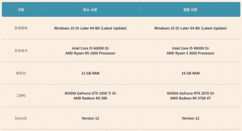현재 넥슨에서 제공하고 있는 아크 레이더스의 공식 시스템 요구 사양 (PC 사양 정보)은 다음과 같습니다.