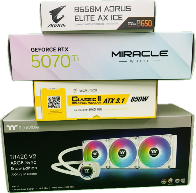 RYZEN7 9800X3D RTX 5070 Ti D7 16GB B650M WIFI DDR5-6000 64GB (32GB*2) SSD 2TB / HDD 4TB 850W GOLD RTM-PLUS (white) / TH420 |