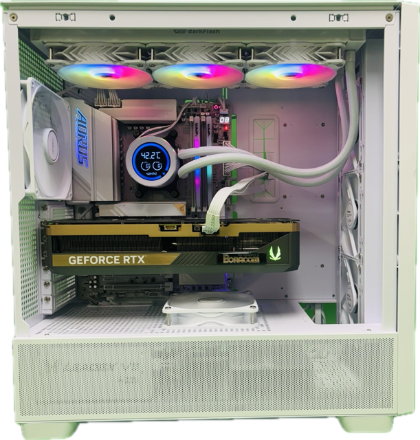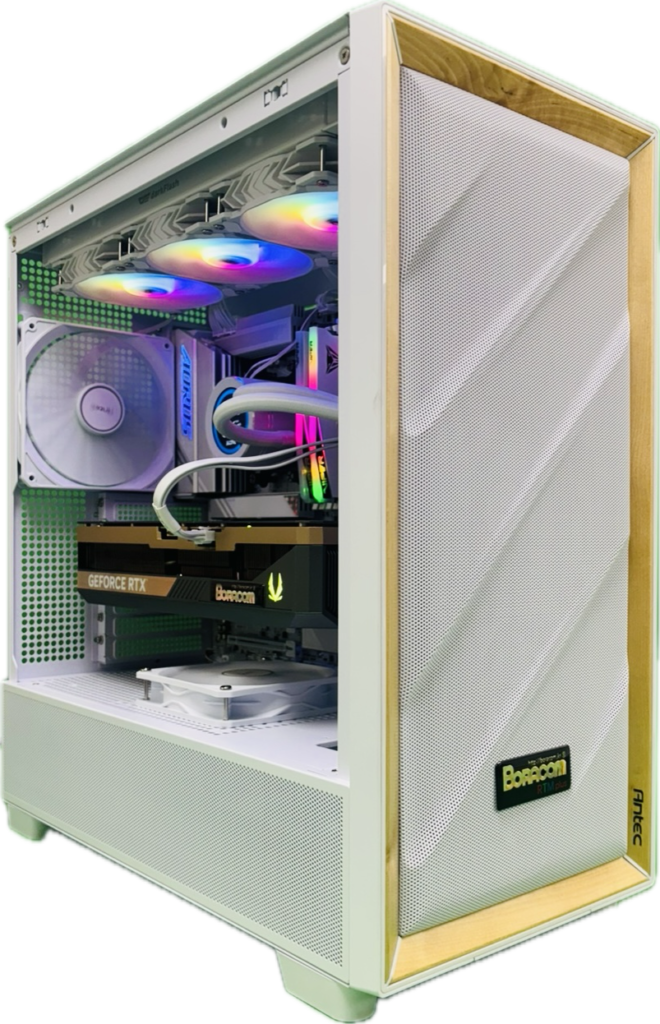 최종적으로 보라컴 RTM-PLUS 화이트 튜닝이 적용되어 있습니다. 세련된 화이트 빌드와 효율적인 쿨링 시스템은 조용하고 안정적인 게이밍·방송 환경을 만들어 주며, 책상 위에 올려두고 싶은 수준의 완성도를 제공합니다.