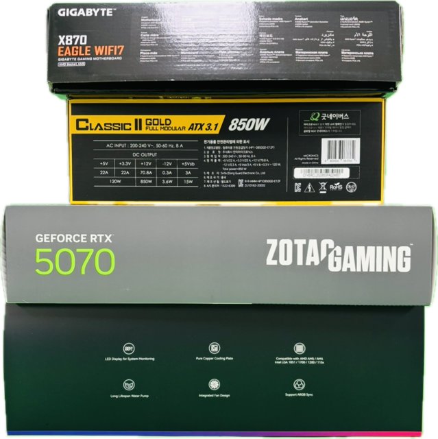 RYZEN9 9900X RTX 5070 OC D7 12GB X870 WIFI DDR5-6000 32GB (16GB*2) SSD 1TB 850W GOLD RTM-PLUS (black) / TS4 |