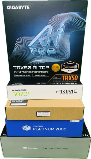 RYZEN Threadripper 9980X TRX50 AI RTX PRO 4000 D7 24GB RTX 5070 Ti OC D7 16GB DDR5-5600 128GB (32GB*4) SSD 2TB(*2개) / HDD 4TB 2000W PLATINUM Velocium (black) / AW420 |