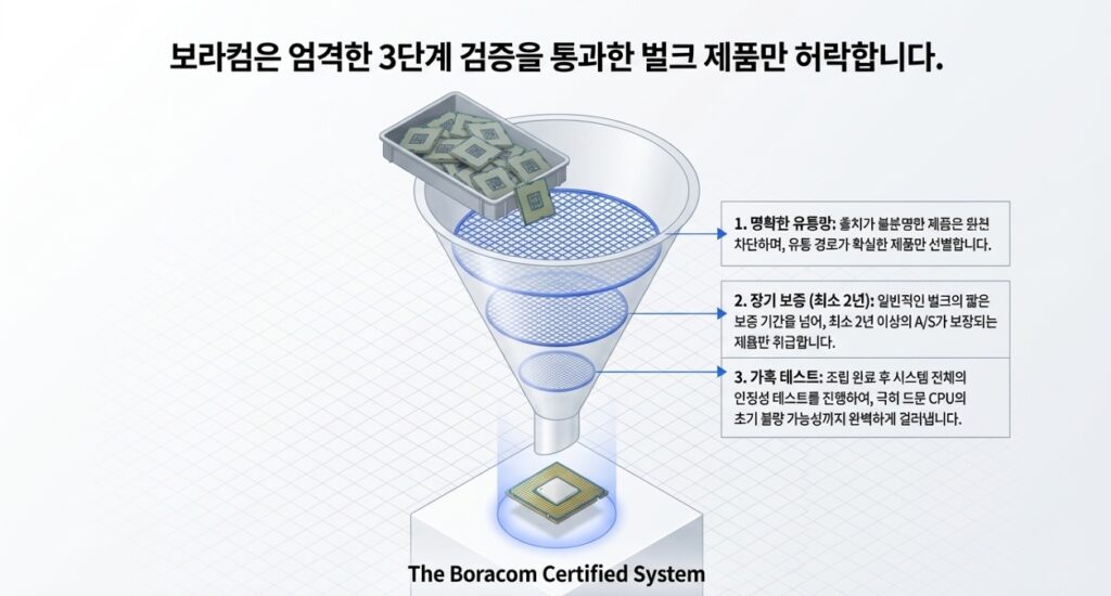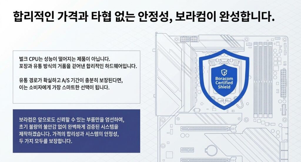 다만 중요한 것은 유통 경로와 A/S 기간입니다. 보라컴에서는 벌크 CPU를 취급할 때 명확한 기준을 가지고 있습니다. 바로 최소 2년 이상의 A/S가 보장되는 제품만 사용한다는 원칙입니다. 유통 경로가 분명하고 장기간 A/S가 가능한 벌크 제품만 선별해 사용하기 때문에 고객 입장에서도 안심하고 사용할 수 있습니다.