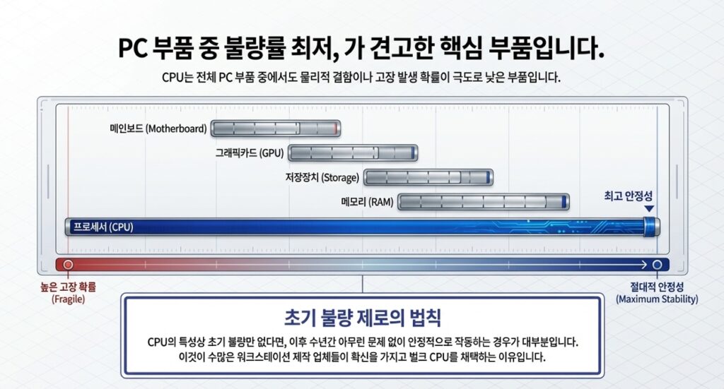 또 하나 중요한 사실이 있습니다. CPU는 전체 PC 부품 중에서도 불량률이 매우 낮은 부품입니다. 초기 불량만 없다면 오랜 기간 안정적으로 사용하는 경우가 대부분입니다.
