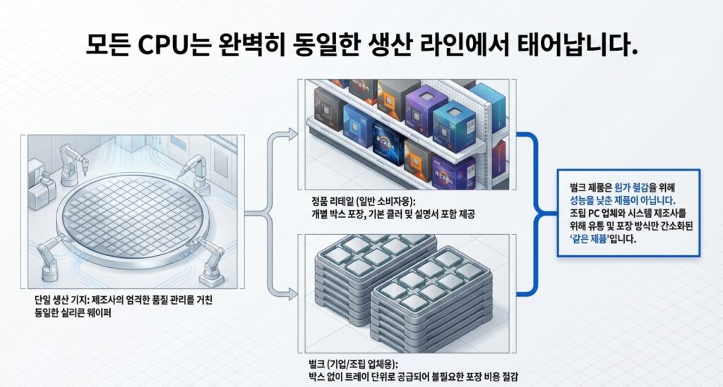먼저 CPU의 유통 구조를 이해하면 이 질문은 생각보다 쉽게 풀립니다. CPU는 제조사에서 생산된 뒤 정품 리테일과 벌크 두 가지 방식으로 시장에 공급됩니다.
