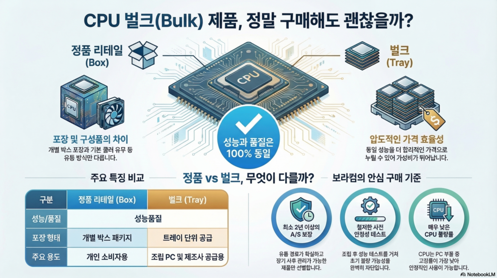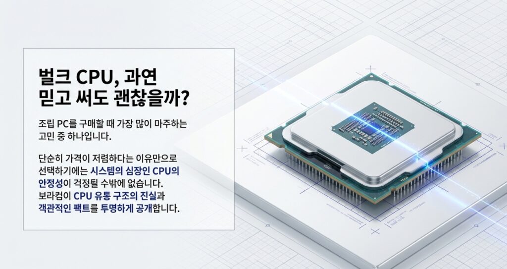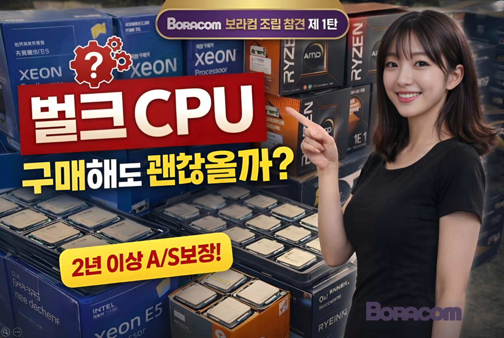 이번 내용은 보라컴 조립 참견 1편으로, 많은 분들이 궁금해하시는 주제인 **“CPU 벌크 제품을 구매해도 괜찮을까?”**에 대한 내용입니다.
