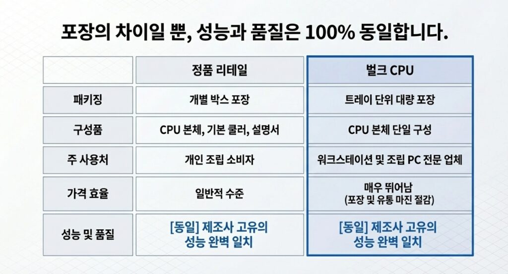 반면 벌크 CPU는 조립 PC 업체나 시스템 제조사를 위해 트레이 단위로 공급되는 제품입니다. 개별 박스 포장이 없을 뿐, CPU 자체는 정품과 완전히 동일한 생산 라인에서 만들어진 같은 제품입니다. 성능이나 품질 차이는 전혀 없습니다.