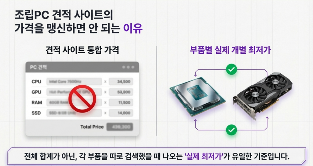 여기서 중요한 점은 조립PC 견적 사이트 가격이 아니라, 각 부품을 따로 검색했을 때 나오는 실제 최저가를 기준으로 보셔야 한다는 점입니다. 확인 방법은 어렵지 않습니다. CPU, 그래픽카드, 메모리, SSD 같은 주요 부품 가격을 하나씩 확인해서 현재 최저가와 비슷한 수준인지 보시면 됩니다.
