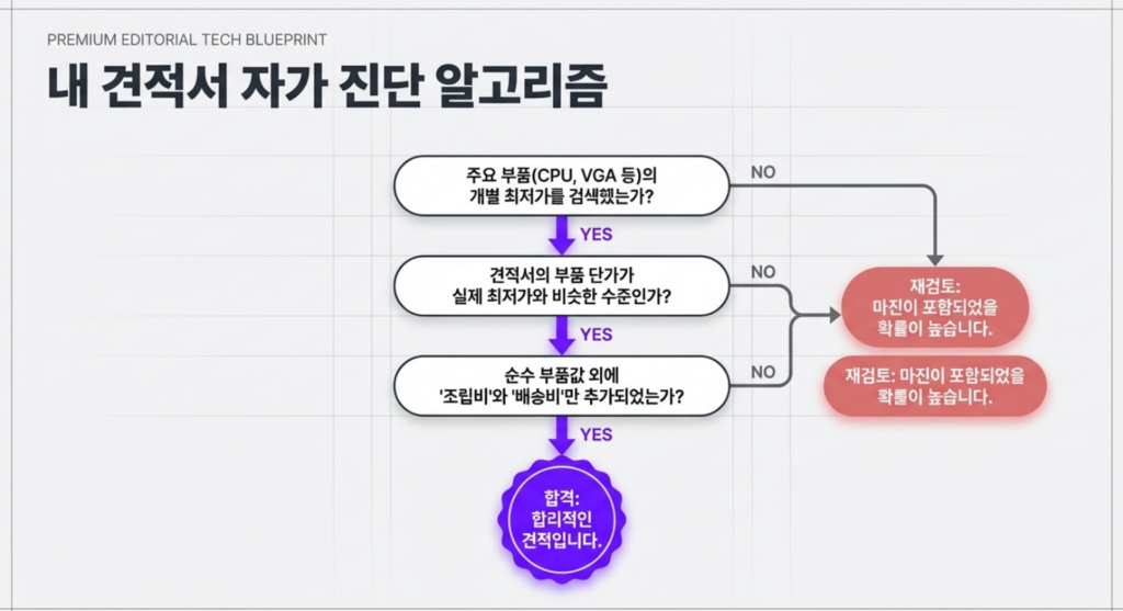 만약 모든 부품 가격이 최저가와 크게 차이 나지 않고, 여기에 조립비와 배송비 정도만 추가되어 있다면 그 견적은 합리적인 가격이라고 보셔도 됩니다.